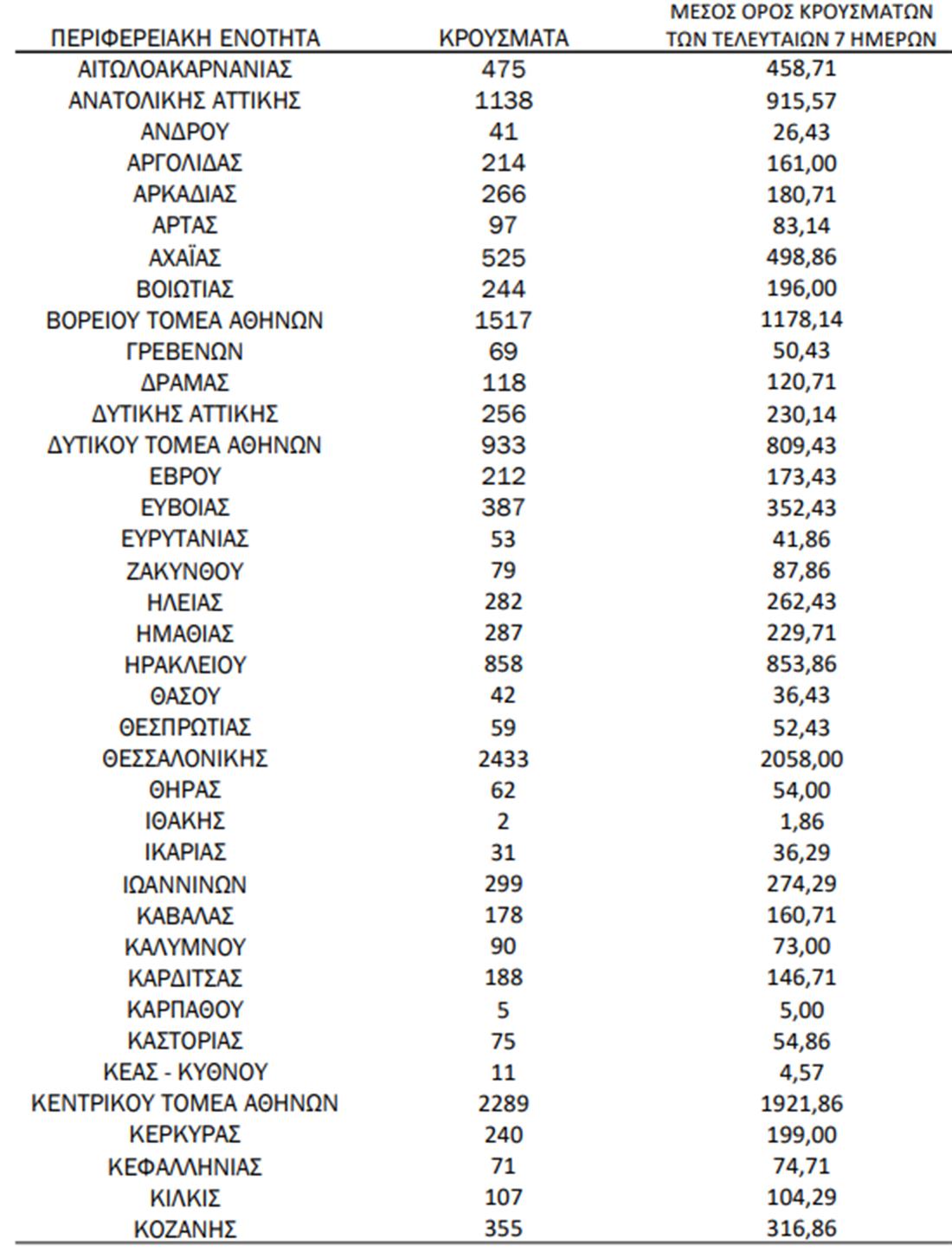 Τα νέα εργαστηριακά επιβεβαιωμένα κρούσματα της νόσου που καταγράφηκαν τις τελευταίες 24 ώρες είναι 23.106, εκ των οποίων 20 εντοπίστηκαν κατόπιν ελέγχων στις πύλες εισόδου της χώρας. Ο συνολικός αριθμός των κρουσμάτων ανέρχεται σε 2.861.993 (ημερήσια μεταβολή +0.8%), εκ των οποίων 49.2% άνδρες. Με βάση τα επιβεβαιωμένα κρούσματα των τελευταίων 7 ημερών, 158 θεωρούνται σχετιζόμενα με ταξίδι από το εξωτερικό και 1.385 είναι σχετιζόμενα με ήδη γνωστό κρούσμα. To Rt για την επικράτεια βάσει των κρουσμάτων εκτιμάται σε 1.04 (95% ΔΕ: 0.95 – 1.13)