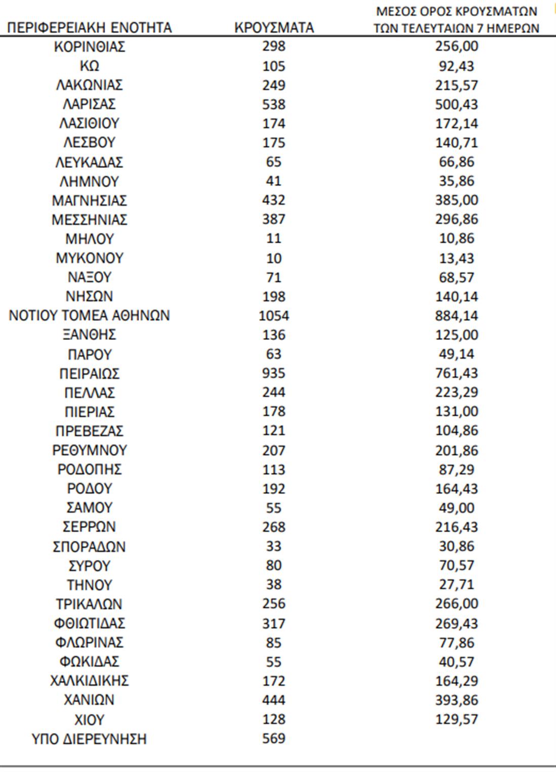 Τα νέα εργαστηριακά επιβεβαιωμένα κρούσματα της νόσου που καταγράφηκαν τις τελευταίες 24 ώρες είναι 23.106, εκ των οποίων 20 εντοπίστηκαν κατόπιν ελέγχων στις πύλες εισόδου της χώρας. Ο συνολικός αριθμός των κρουσμάτων ανέρχεται σε 2.861.993 (ημερήσια μεταβολή +0.8%), εκ των οποίων 49.2% άνδρες. Με βάση τα επιβεβαιωμένα κρούσματα των τελευταίων 7 ημερών, 158 θεωρούνται σχετιζόμενα με ταξίδι από το εξωτερικό και 1.385 είναι σχετιζόμενα με ήδη γνωστό κρούσμα. To Rt για την επικράτεια βάσει των κρουσμάτων εκτιμάται σε 1.04 (95% ΔΕ: 0.95 – 1.13)