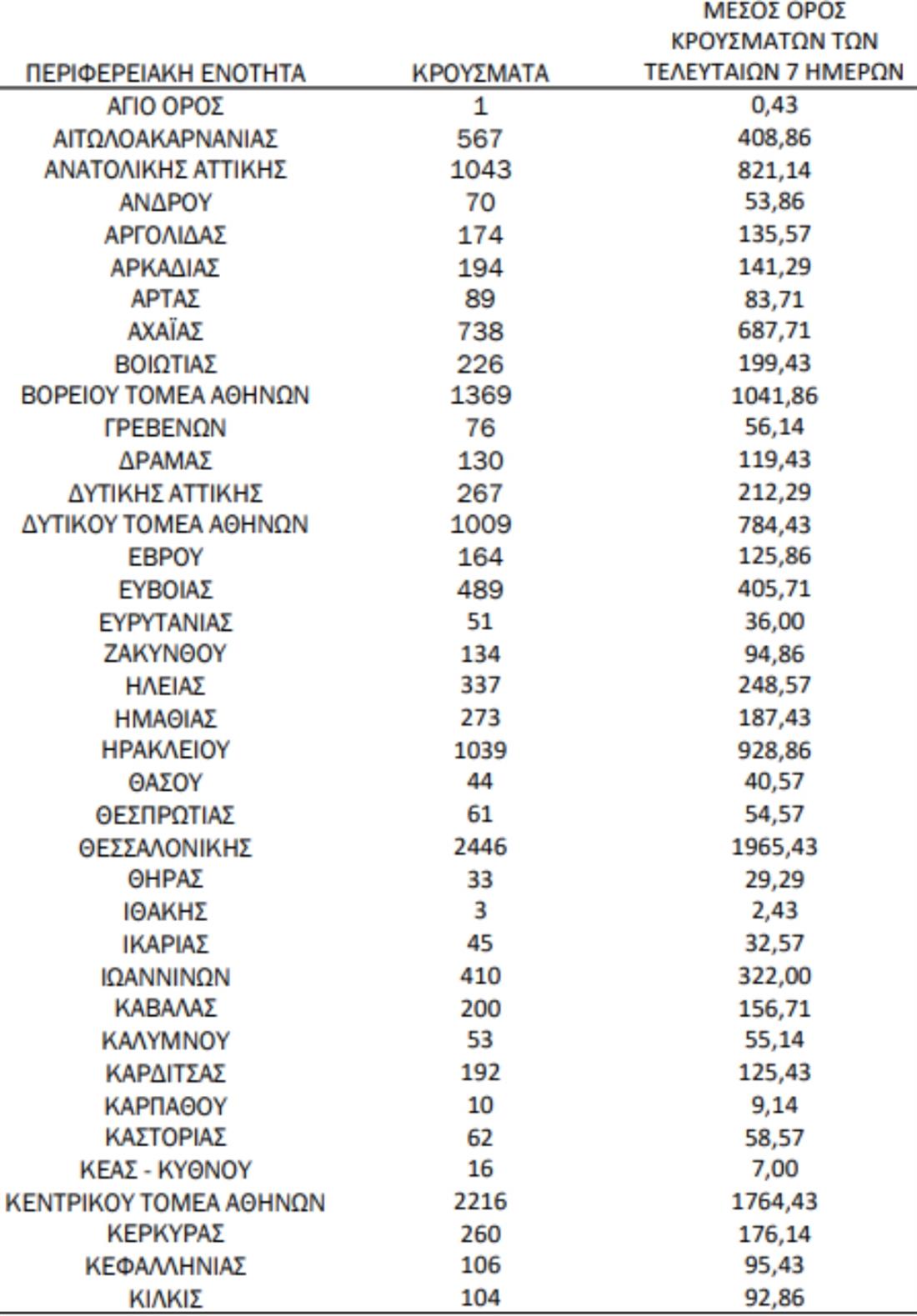 Τα νέα εργαστηριακά επιβεβαιωμένα κρούσματα της νόσου που καταγράφηκαν τις τελευταίες 24 ώρες είναι 23.748, εκ των οποίων 23 εντοπίστηκαν κατόπιν ελέγχων στις πύλες εισόδου της χώρας. Ο συνολικός αριθμός των κρουσμάτων ανέρχεται σε 2.708.610 (ημερήσια μεταβολή +0.9%), εκ των οποίων 49.3% άνδρες. Με βάση τα επιβεβαιωμένα κρούσματα των τελευταίων 7 ημερών, 211 θεωρούνται σχετιζόμενα με ταξίδι από το εξωτερικό και 1.564 είναι σχετιζόμενα με ήδη γνωστό κρούσμα.