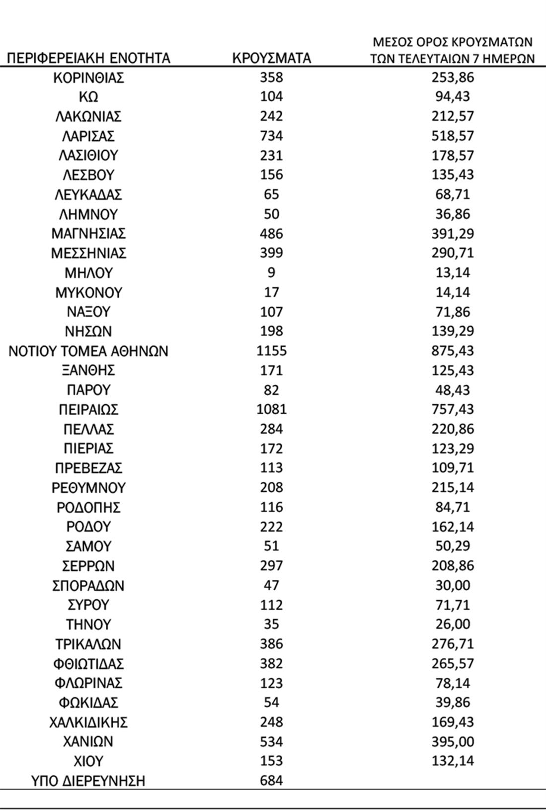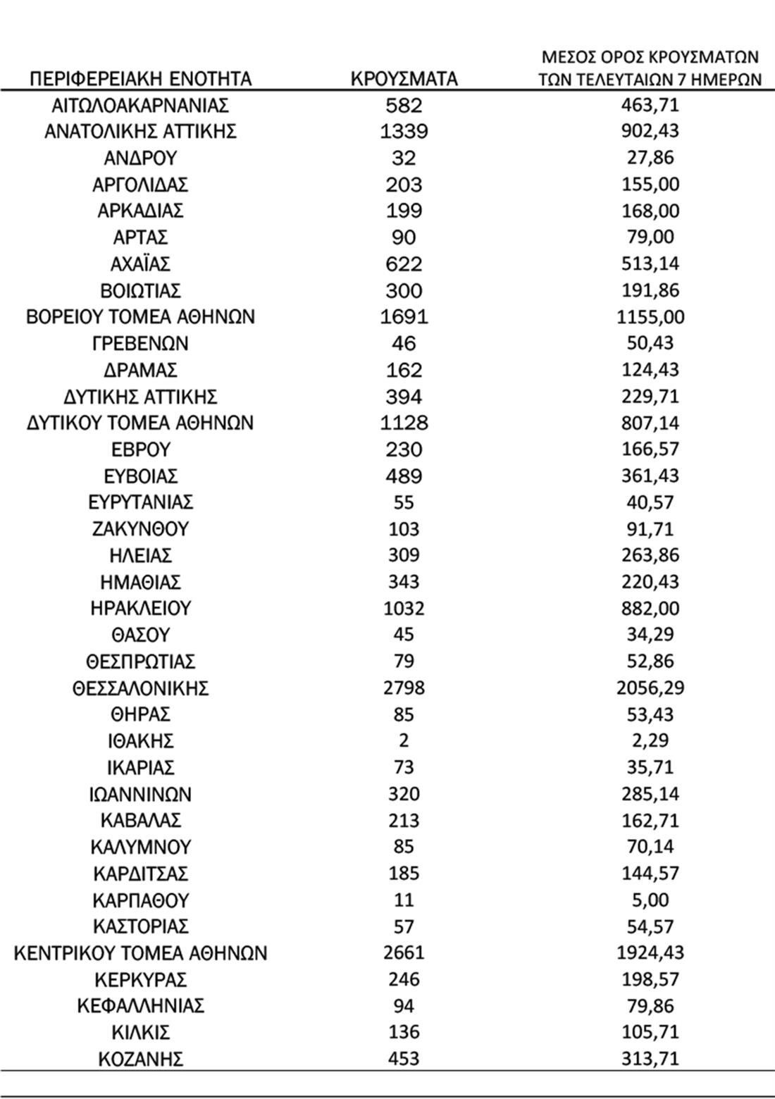 Τα νέα εργαστηριακά επιβεβαιωμένα κρούσματα της νόσου που καταγράφηκαν τις τελευταίες 24 ώρες είναι 26.785, εκ των οποίων 21 εντοπίστηκαν κατόπιν ελέγχων στις πύλες εισόδου της χώρας. Ο συνολικός αριθμός των κρουσμάτων ανέρχεται σε 2.838.891 (ημερήσια μεταβολή +1.0%), εκ των οποίων 49.2% άνδρες. Με βάση τα επιβεβαιωμένα κρούσματα των τελευταίων 7 ημερών, 170 θεωρούνται σχετιζόμενα με ταξίδι από το εξωτερικό και 1.451 είναι σχετιζόμενα με ήδη γνωστό κρούσμα.