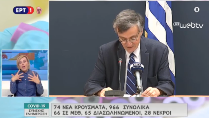 Στα 966 ανέρχονται τα κρούσματα του κορωνοϊού στην Ελλάδα, σύμφωνα με την ενημέρωση του εκπροσώπου του υπουργείου Υγείας, καθηγητή Λοιμωξιολογίας, Σωτήρη Τσιόδρα. Τα νέα είναι 74 ενώ οι θάνατοι 28. 65 νοσηλεύονται διασωληνωμένοι.