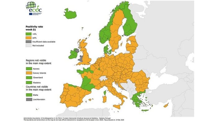 Αισιόδοξα είναι τα νέα που φτάνουν από το Ευρωπαϊκό Κέντρο Πρόληψης και Ελέγχου Νόσων για τη χώρα μας, καθώς στον τελευταίο χάρτη θετικότητας που δημοσίευσε, η Ελλάδα βρίσκεται στο πράσινο χρώμα, πράγμα που σημαίνει ότι έπεσε κάτω από το όριο του 4% στη θετικότητα των τεστ κορωνοϊού που διενεργούνται.