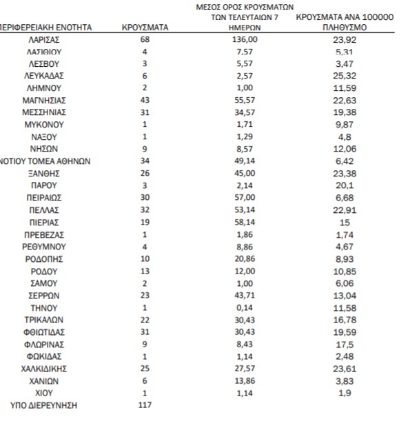 ΕΟΔΥ: 68 νέα κρούσματα στην ΠΕ Λάρισας