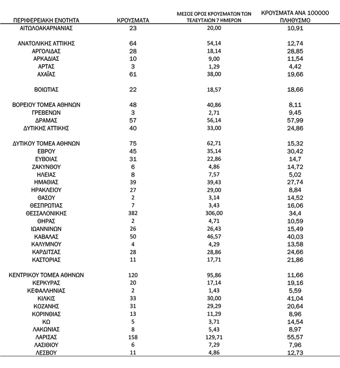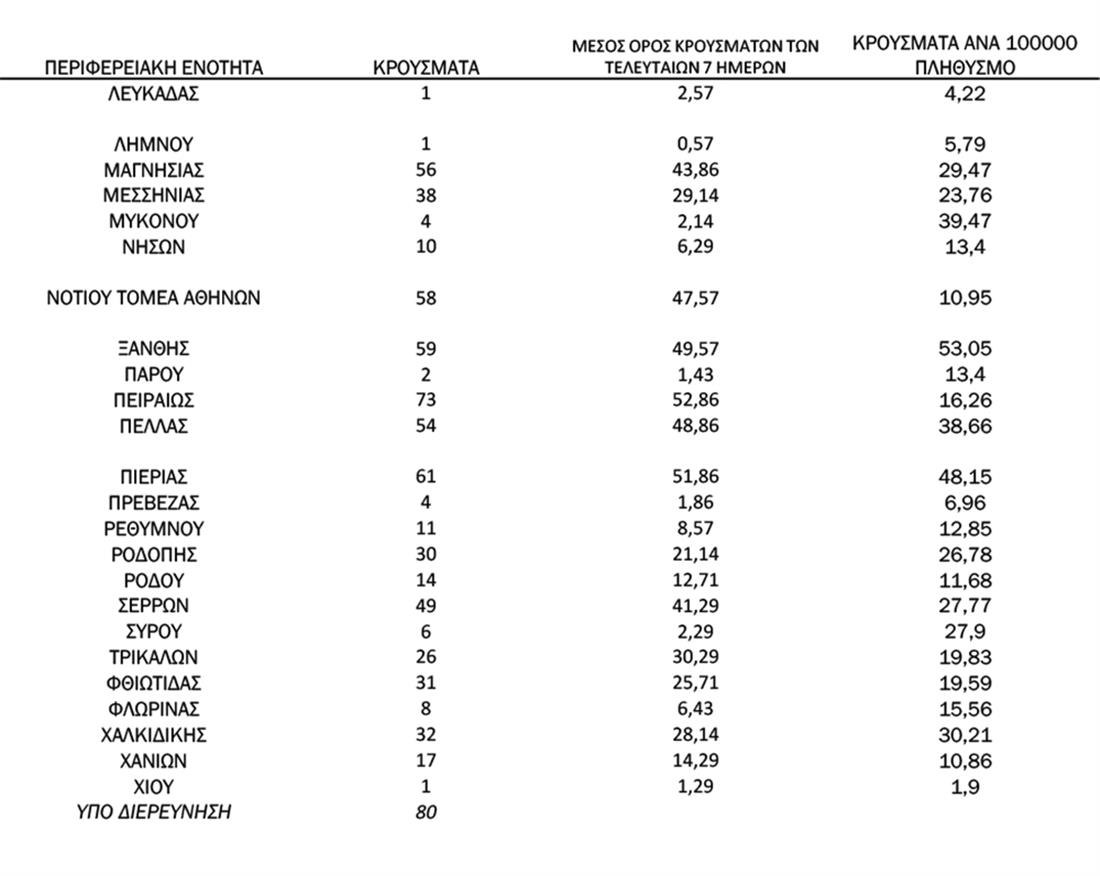 Τα νέα εργαστηριακά επιβεβαιωμένα κρούσματα της νόσου που καταγράφηκαν τις τελευταίες 24 ώρες είναι 2.249, εκ των οποίων 6 εντοπίστηκαν κατόπιν ελέγχων στις πύλες εισόδου της χώρας. Ο συνολικός αριθμός των κρουσμάτων ανέρχεται σε 671.040 (ημερήσια μεταβολή +0.3%), εκ των οποίων 50.9% άνδρες.1Με βάση τα επιβεβαιωμένα κρούσματα των τελευταίων 7 ημερών, 114 θεωρούνται σχετιζόμενα με ταξίδι από το εξωτερικό και 3.126 είναι σχετιζόμενα με ήδη γνωστό κρούσμα.