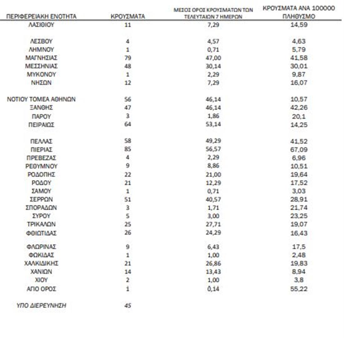 Τα νέα εργαστηριακά επιβεβαιωμένα κρούσματα της νόσου που καταγράφηκαν τις τελευταίες 24 ώρες είναι 2.324 , εκ των οποίων 5 εντοπίστηκαν κατόπιν ελέγχων στις πύλες εισόδου της χώρας. Ο συνολικός αριθμός των κρουσμάτων ανέρχεται σε 673.317 (ημερήσια μεταβολή +0.3%), εκ των οποίων 50.9% άνδρες. Με βάση τα επιβεβαιωμένα κρούσματα των τελευταίων 7 ημερών, 119 θεωρούνται σχετιζόμενα με ταξίδι από το εξωτερικό και 3.287 είναι σχετιζόμενα με ήδη γνωστό κρούσμα.