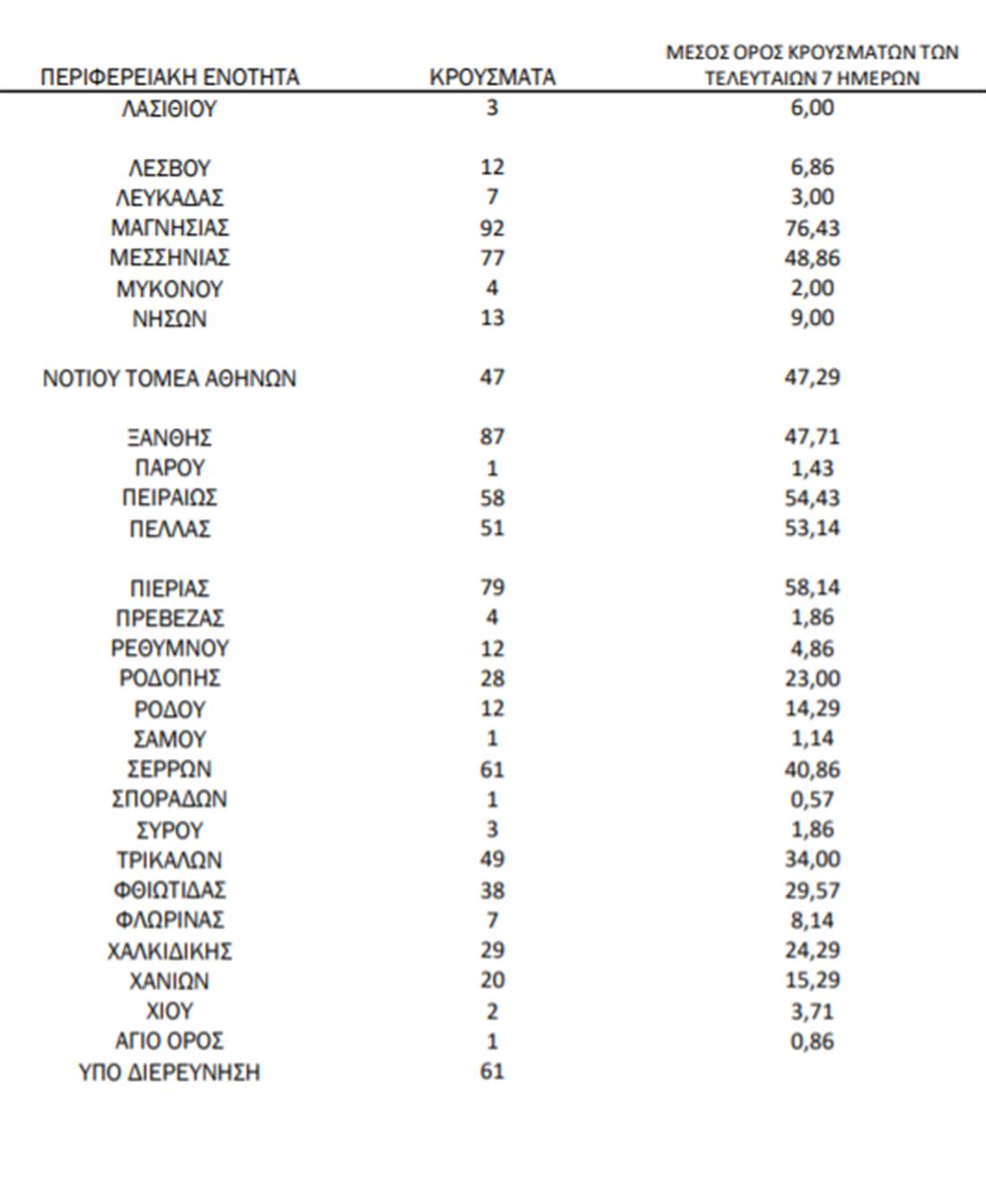 Με βάση τα επιβεβαιωμένα κρούσματα των τελευταίων 7 ημερών, 107 θεωρούνται σχετιζόμενα με ταξίδι από το εξωτερικό και 2.059 είναι σχετιζόμενα με ήδη γνωστό κρούσμα.