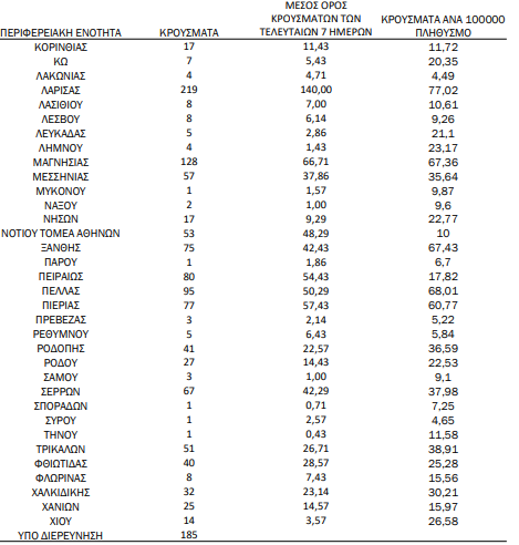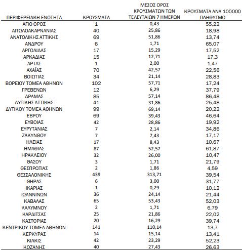 Με βάση τα επιβεβαιωμένα κρούσματα των τελευταίων 7 ημερών, 123 θεωρούνται σχετιζόμενα με ταξίδι από το εξωτερικό και 3.033 είναι σχετιζόμενα με ήδη γνωστό κρούσμα.
