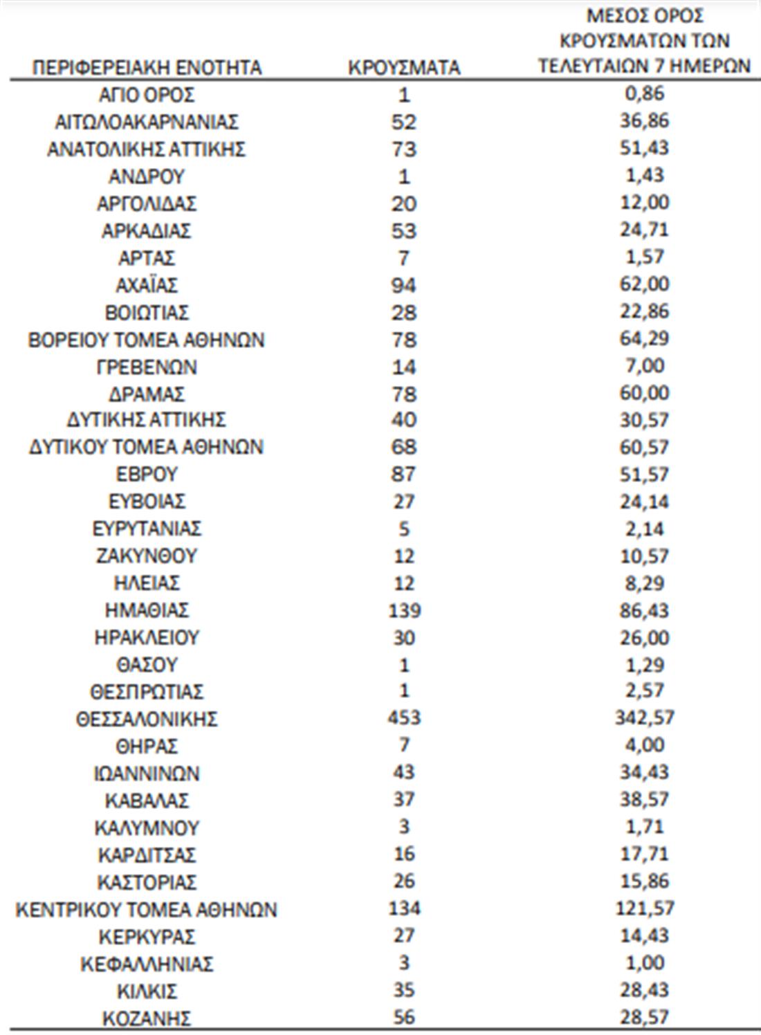 Τα νέα εργαστηριακά επιβεβαιωμένα κρούσματα της νόσου που καταγράφηκαν τις τελευταίες 24 ώρες είναι 3.164 , εκ των οποίων 15 εντοπίστηκαν κατόπιν ελέγχων στις πύλες εισόδου της χώρας. Ο συνολικός αριθμός των κρουσμάτων ανέρχεται σε 697.033 (ημερήσια μεταβολή +0.5%), εκ των οποίων 50.8% άνδρες. Με βάση τα επιβεβαιωμένα κρούσματα των τελευταίων 7 ημερών, 117 θεωρούνται σχετιζόμενα με ταξίδι από το εξωτερικό και 2.102 είναι σχετιζόμενα με ήδη γνωστό κρούσμα.