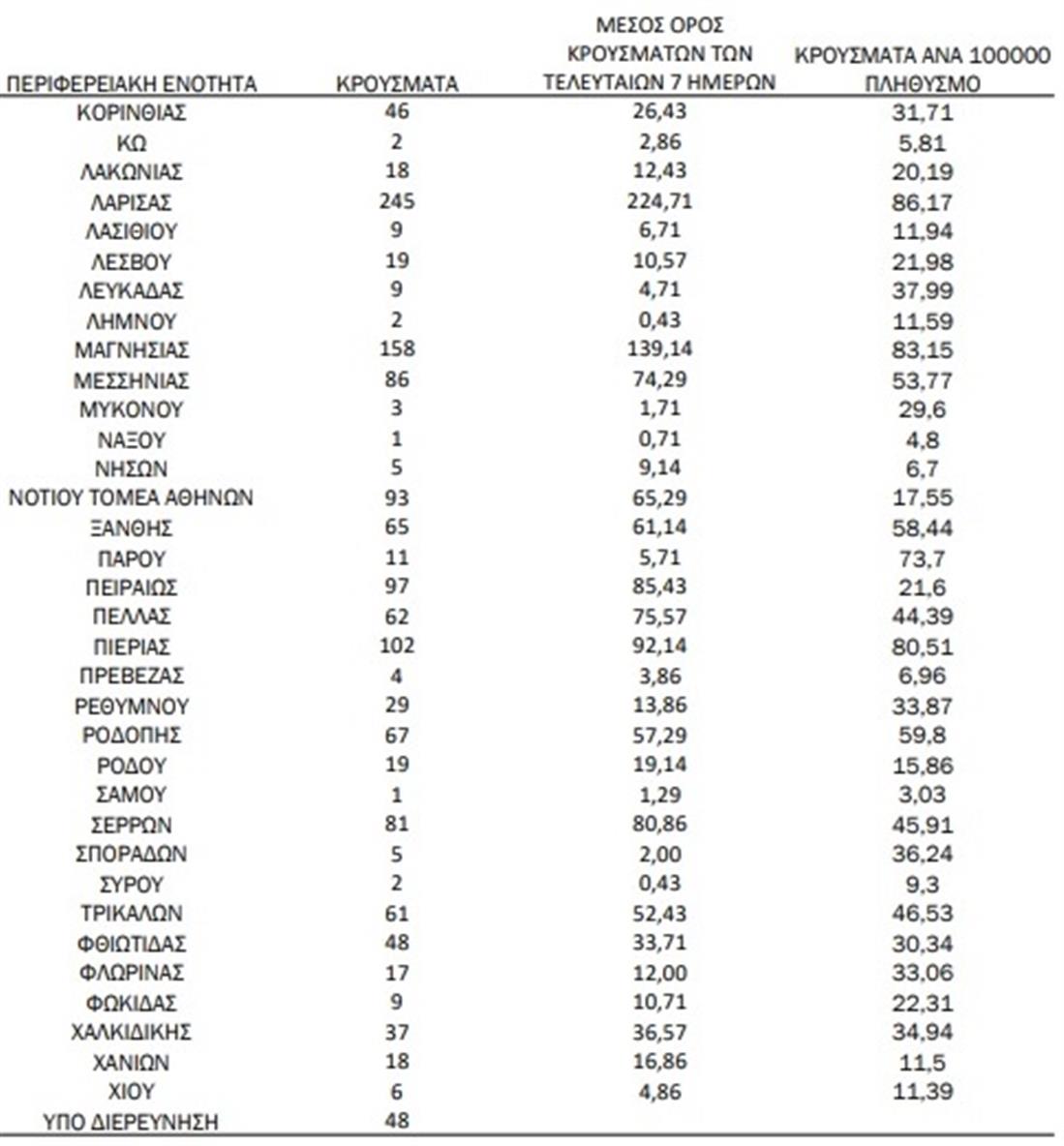 ΕΟΔΥ: 245 νέα κρούσματα στην ΠΕ Λάρισας