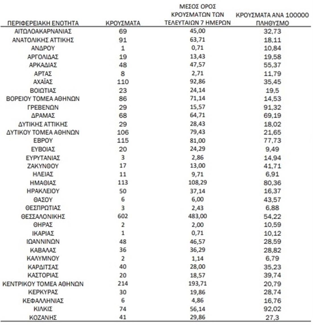 Τα νέα εργαστηριακά επιβεβαιωμένα κρούσματα της νόσου που καταγράφηκαν τις τελευταίες 24 ώρες είναι 3.651, εκ των οποίων 15 εντοπίστηκαν κατόπιν ελέγχων στις πύλες εισόδου της χώρας. Ο συνολικός αριθμός των κρουσμάτων ανέρχεται σε 728.210 (ημερήσια μεταβολή +0.5%), εκ των οποίων 50.8% άνδρες. Με βάση τα επιβεβαιωμένα κρούσματα των τελευταίων 7 ημερών, 151 θεωρούνται σχετιζόμενα με ταξίδι από το εξωτερικό και 2.882 είναι σχετιζόμενα με ήδη γνωστό κρούσμα.