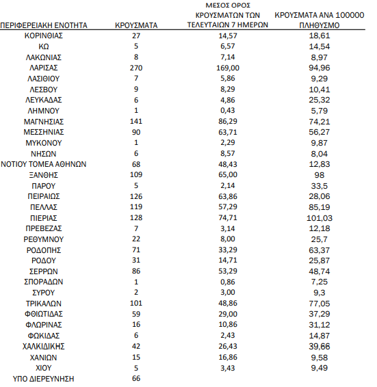 ΕΟΔΥ: 270 νέα κρούσματα στην ΠΕ Λάρισας