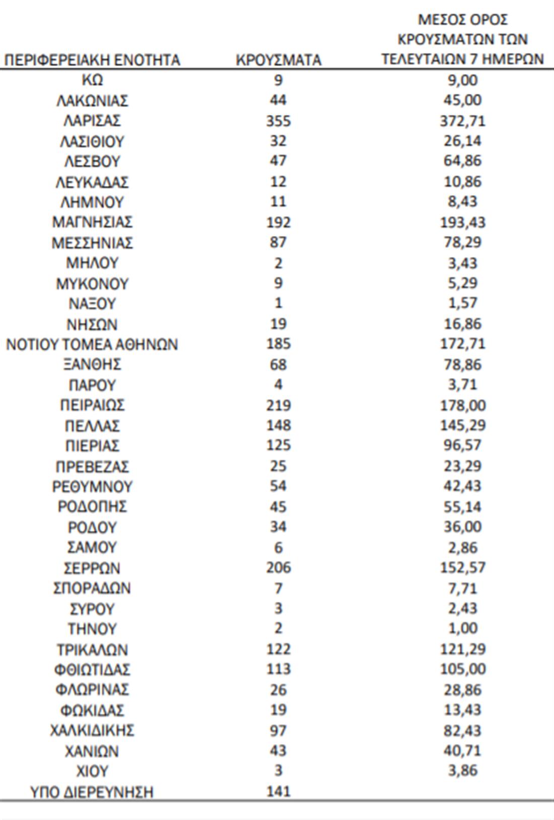 Τα νέα εργαστηριακά επιβεβαιωμένα κρούσματα της νόσου που καταγράφηκαν τις τελευταίες 24 ώρες είναι 6.801, εκ των οποίων 8 εντοπίστηκαν κατόπιν ελέγχων στις πύλες εισόδου της χώρας. Ο συνολικός αριθμός των κρουσμάτων ανέρχεται σε 815.068, εκ των οποίων 50,7% άνδρες. Με βάση τα επιβεβαιωμένα κρούσματα των τελευταίων 7 ημερών, 131 θεωρούνται σχετιζόμενα με ταξίδι από το εξωτερικό και 2.716 είναι σχετιζόμενα με ήδη γνωστό κρούσμα.