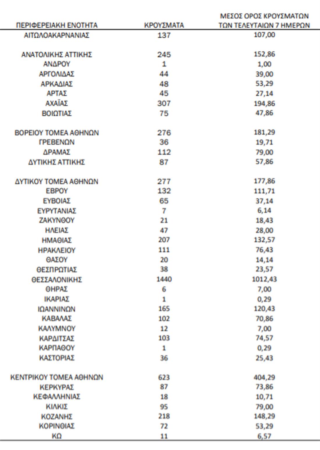 Τα νέα εργαστηριακά επιβεβαιωμένα κρούσματα της νόσου που καταγράφηκαν τις τελευταίες 24 ώρες είναι 8.613, εκ των οποίων 19 εντοπίστηκαν κατόπιν ελέγχων στις πύλες εισόδου της χώρας. Ο συνολικός αριθμός των κρουσμάτων ανέρχεται σε 801.208 (ημερήσια μεταβολή +1.1%), εκ των οποίων 50.7% άνδρες. Με βάση τα επιβεβαιωμένα κρούσματα των τελευταίων 7 ημερών, 140 θεωρούνται σχετιζόμενα με ταξίδι από το εξωτερικό και 2.341 είναι σχετιζόμενα με ήδη γνωστό κρούσμα.