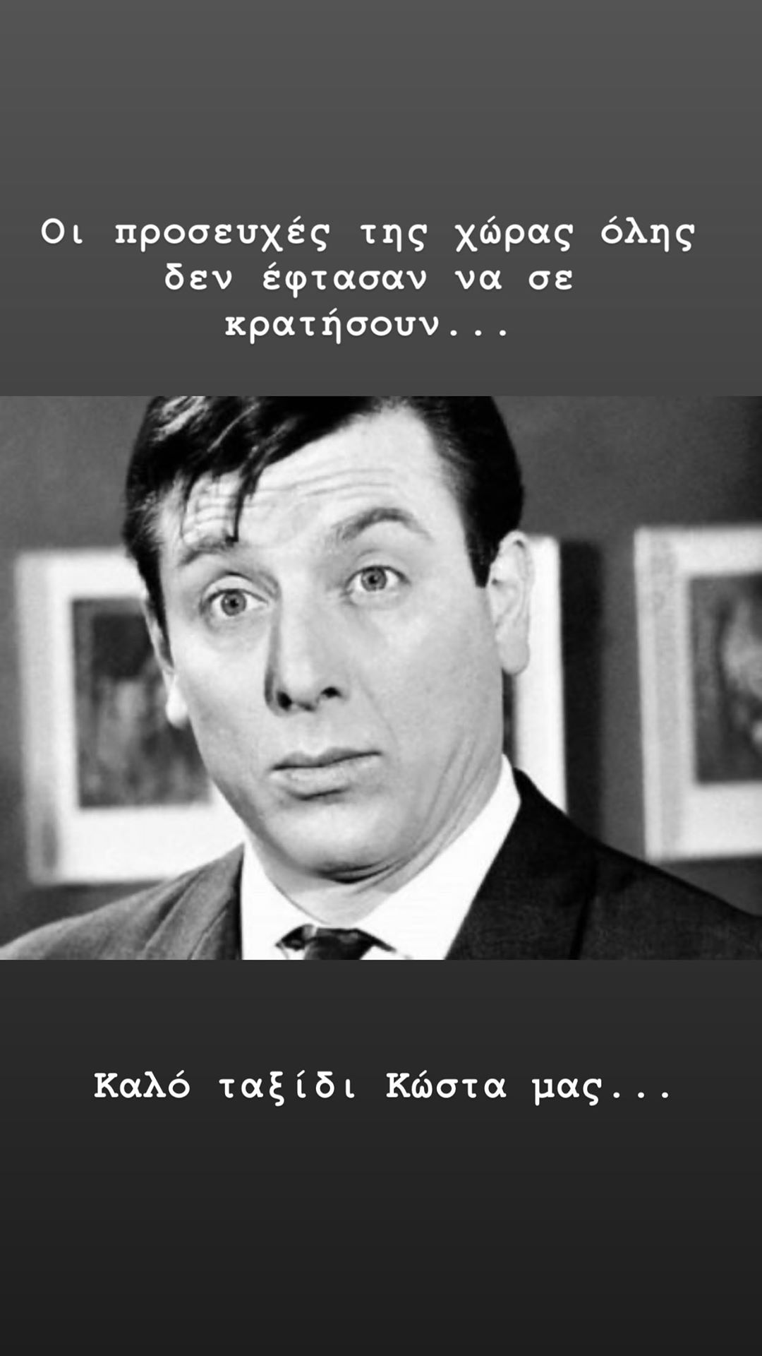 «Κωστάκο μου πολύ σε αγαπούσα και πολύ με αγαπούσες! Θα σε θυμάμαι πάντα με χαμόγελο! Σ ευχαριστώ για τις συμβουλές την εμπιστοσύνη τη δύναμη που μου δίνες πάντα! Σήμερα για πρώτη φορά μας έκανες να κλαίμε βέβαια αλλά έτσι είναι η ζωή…! Θα μου λείψεις πολύ…», έγραψε ο Γιώργος Βάλαρης.