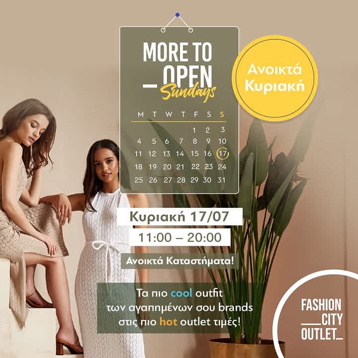 Την προσεχή Κυριακή 17/7 τα καταστήματα του Fashion City Outlet θα είναι ανοιχτά από τις 11 το πρωί έως και τις 8 το βράδυ, λόγω της 1ης Κυριακής των Καλοκαιρινών Εκπτώσεων.