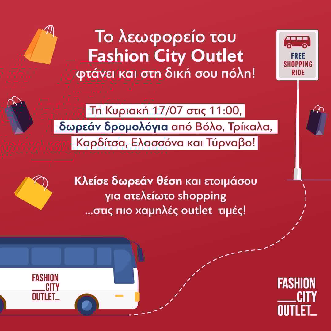 Την Κυριακή 17/7 Δωρεάν λεωφορεία θα ξεκινήσουν στις 11 το πρωί από Βόλο, Τρίκαλα, Καρδίτσα, Ελασσόνα και Τύρναβο με προορισμό το Fashion City Outlet τον αγαπημένο εκπτωτικό προορισμό όλης της Θεσσαλίας!