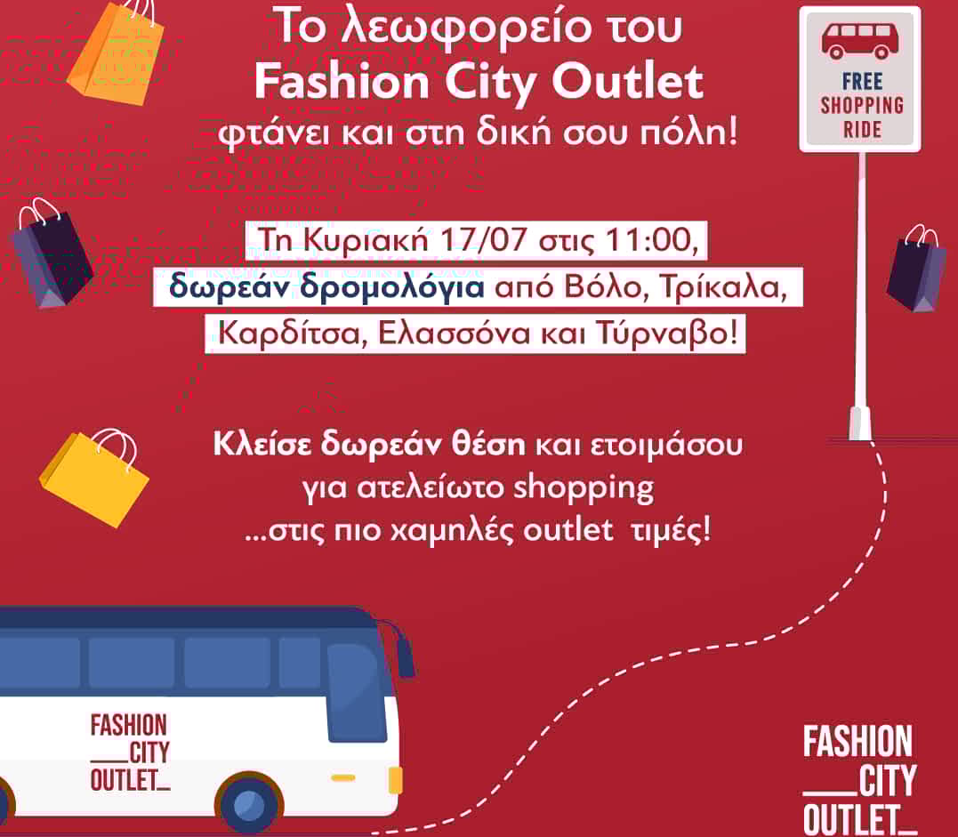 Την Κυριακή 17/7 Δωρεάν λεωφορεία θα ξεκινήσουν στις 11 το πρωί από Βόλο, Τρίκαλα, Καρδίτσα, Ελασσόνα και Τύρναβο με προορισμό το Fashion City Outlet τον αγαπημένο εκπτωτικό προορισμό όλης της Θεσσαλίας!