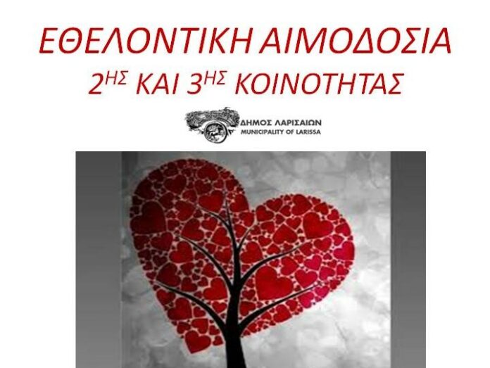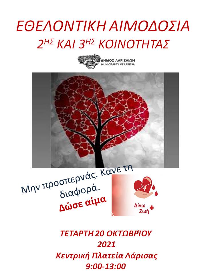 Αιμοδοσία διοργανώνει η 2η και η 3η κοινότητα του Δήμου Λαρισαίων μαζί με το Επιμελητήριο Λάρισας την Τετάρτη 20 Οκτωβρίου 2021 στην Κεντρική