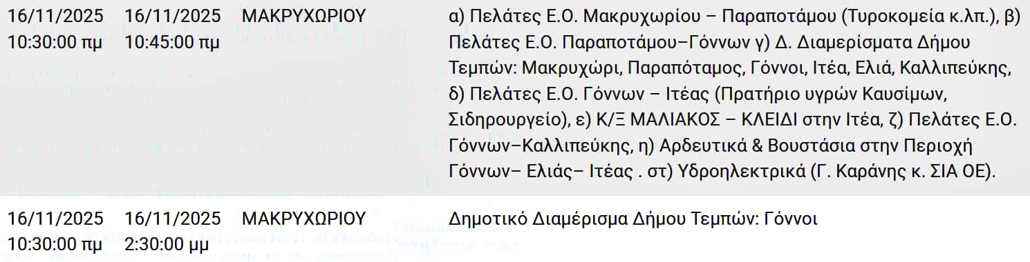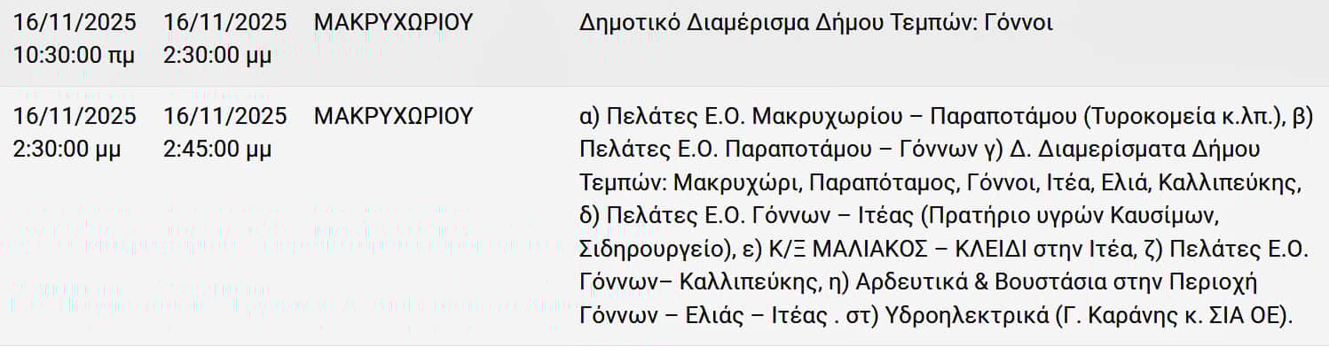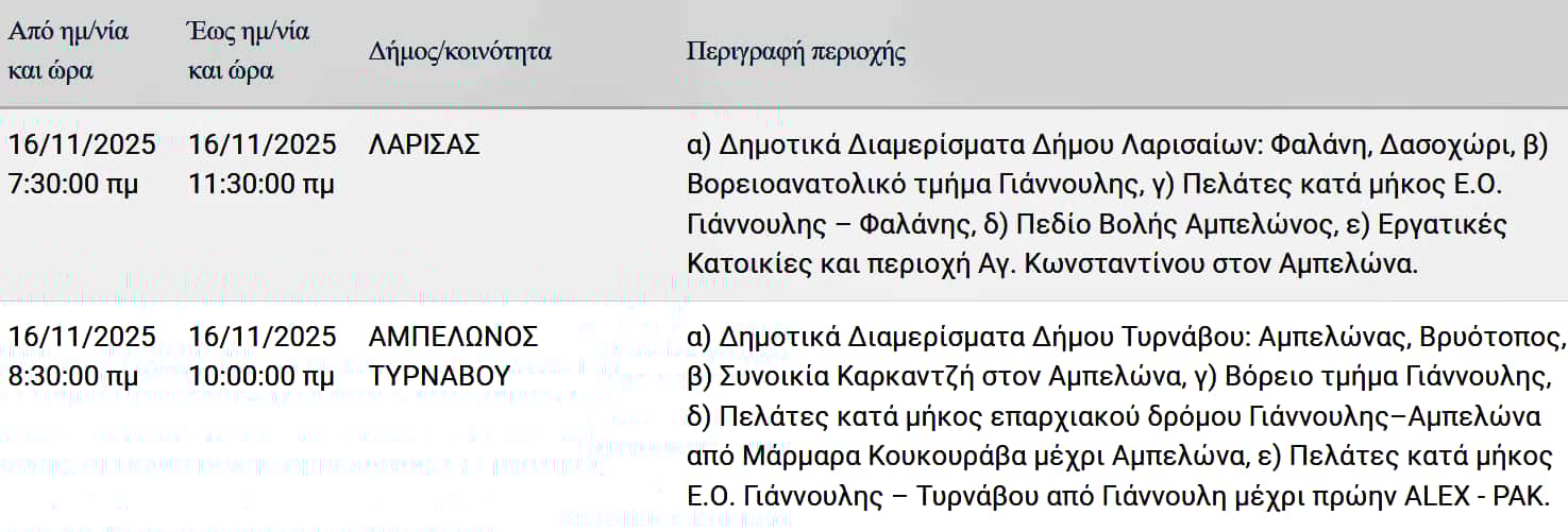 Σε προγραμματισμένες διακοπές ρεύματος σε περιοχές της Π. Ε. Λάρισας θα προχωρήσει αύριο Κυριακή 16 Νοεμβρίου 2025 ο ΔΕΔΔΗΕ Α.Ε.