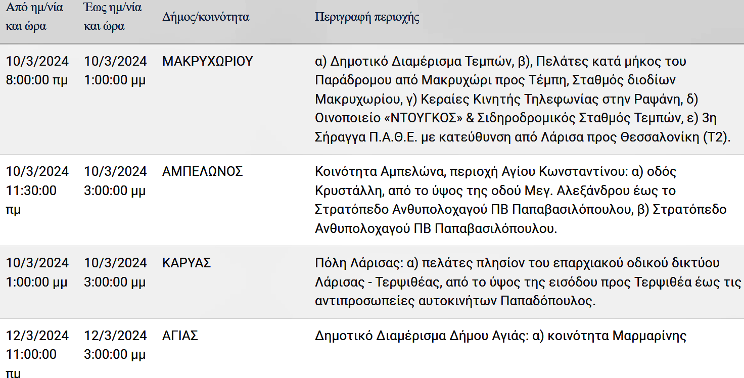 Σε προγραμματισμένες διακοπές ρεύματος σε δρόμους της Λάρισας και περιοχές της Π. Ε. Λάρισας θα προχωρήσει σήμερα Κυριακή 10 αλλά και την Τρίτη 12 Μαρτίου 2024 ο ΔΕΔΔΗΕ Α.Ε.