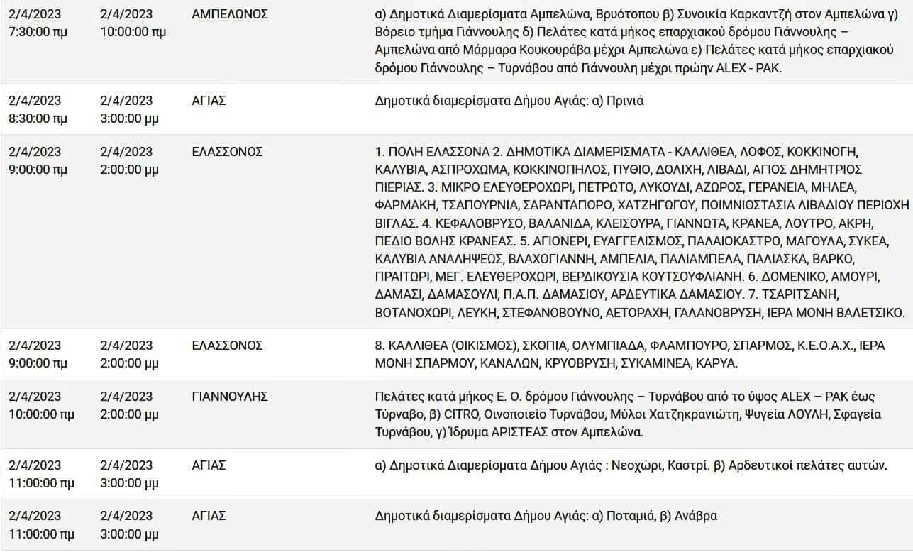 | 2/4/2023 7:30:00 πμ | 2/4/2023 10:00:00 πμ | ΑΜΠΕΛΩΝΟΣ | α) Δημοτικά Διαμερίσματα Αμπελώνα, Βρυότοπου β) Συνοικία Καρκαντζή στον Αμπελώνα γ) Βόρειο τμήμα Γιάννουλης δ) Πελάτες κατά μήκος επαρχιακού δρόμου Γιάννουλης – Αμπελώνα από Μάρμαρα Κουκουράβα μέχρι Αμπελώνα ε) Πελάτες κατά μήκος επαρχιακού δρόμου Γιάννουλης – Τυρνάβου από Γιάννουλη μέχρι πρώην ALEX – PAK. | Κατασκευές | |