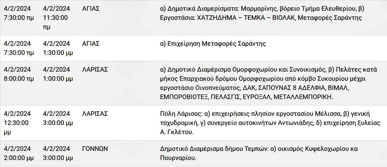 Σε προγραμματισμένες διακοπές ρεύματος σε περιοχές της Λάρισας και της Π. Ε. Λάρισας θα προχωρήσει σήμερα Κυριακή 4 Φεβρουαρίου 2024 ο ΔΕΔΔΗΕ Α.Ε.