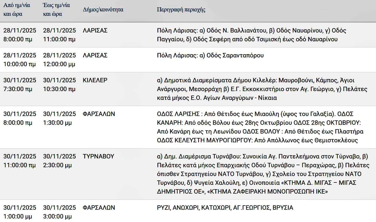 Σε προγραμματισμένες διακοπές ρεύματος σε περιοχές της Λάρισας και της Π. Ε. Λάρισας θα προχωρήσει σήμερα Παρασκευή 28 και Κυριακή 30 Νοεμβρίου 2025 ο ΔΕΔΔΗΕ Α.Ε.