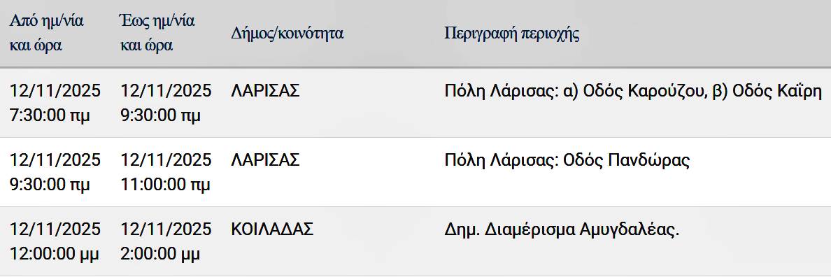 Σε προγραμματισμένες διακοπές ρεύματος σε περιοχές της Λάρισας θα προχωρήσει σήμερα Τετάρτη 12 Νοεμβρίου 2025 ο ΔΕΔΔΗΕ Α.Ε.