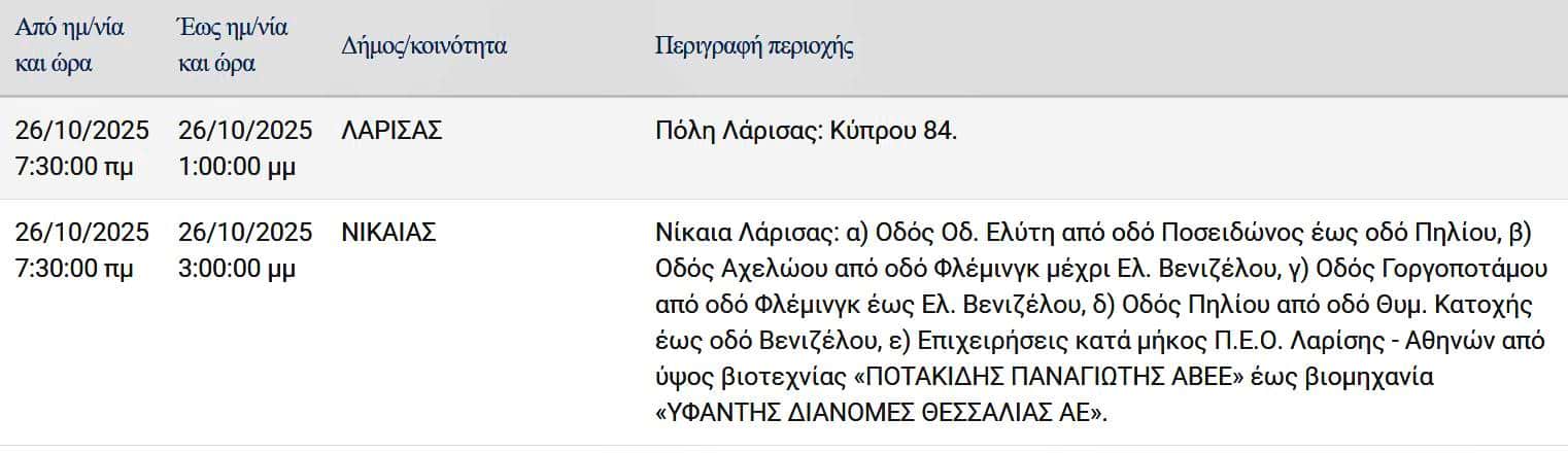 Σε προγραμματισμένες διακοπές ρεύματος σε δρόμο της Λάρισας και περιοχές της Π. Ε. Λάρισας θα προχωρήσει την Κυριακή 26 Οκτωβρίου 2025 ο ΔΕΔΔΗΕ Α.Ε.
