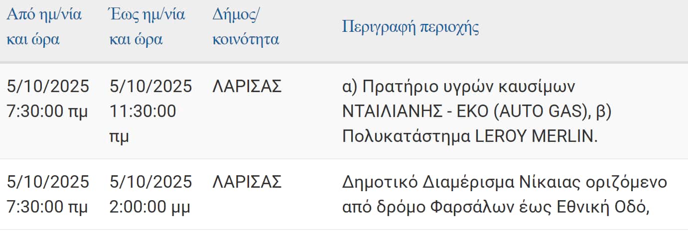 Σε προγραμματισμένες διακοπές ρεύματος σε περιοχές της Π. Ε. Λάρισας θα προχωρήσει την Κυριακή 5 Οκτωβρίου 2025 ο ΔΕΔΔΗΕ Α.Ε.
