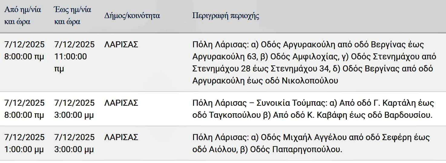 Σε προγραμματισμένες διακοπές ρεύματος σε δρόμους της Λάρισας θα προχωρήσει την Κυριακή 7 Δεκεμβρίου 2025 ο ΔΕΔΔΗΕ Α.Ε.