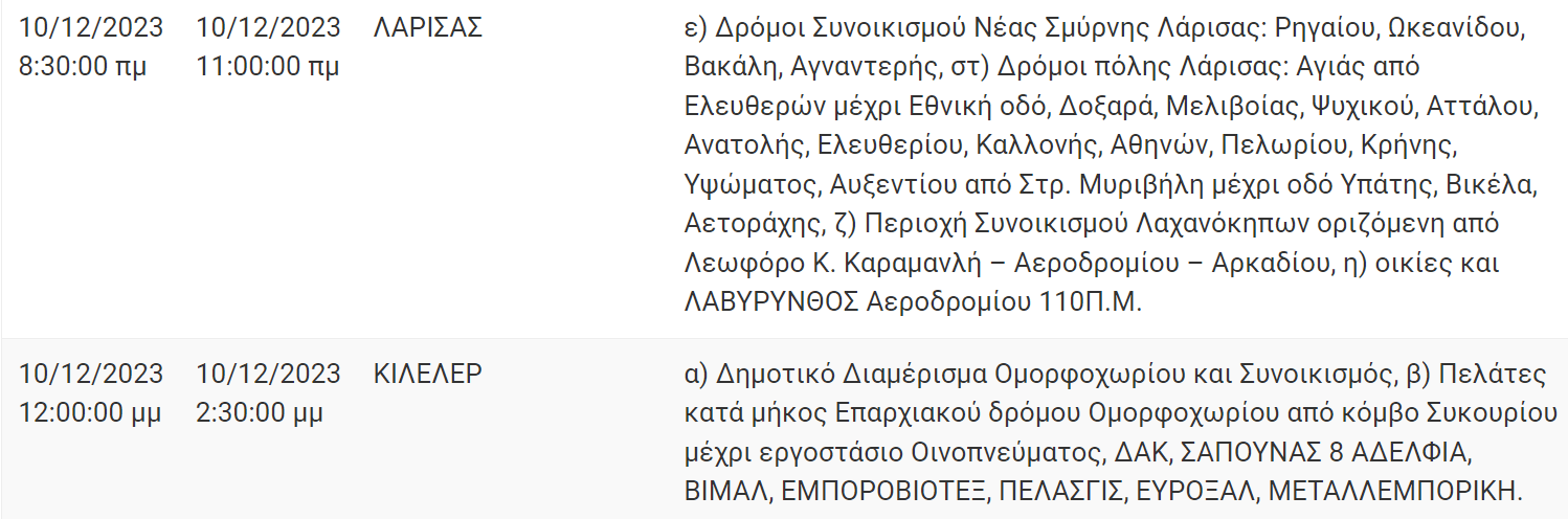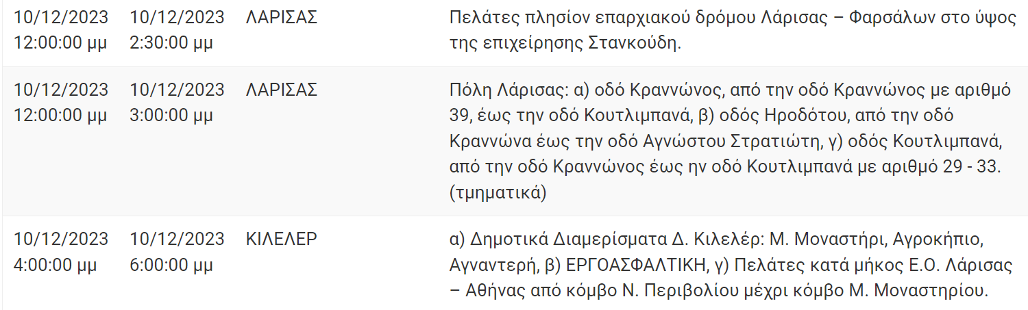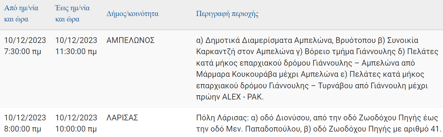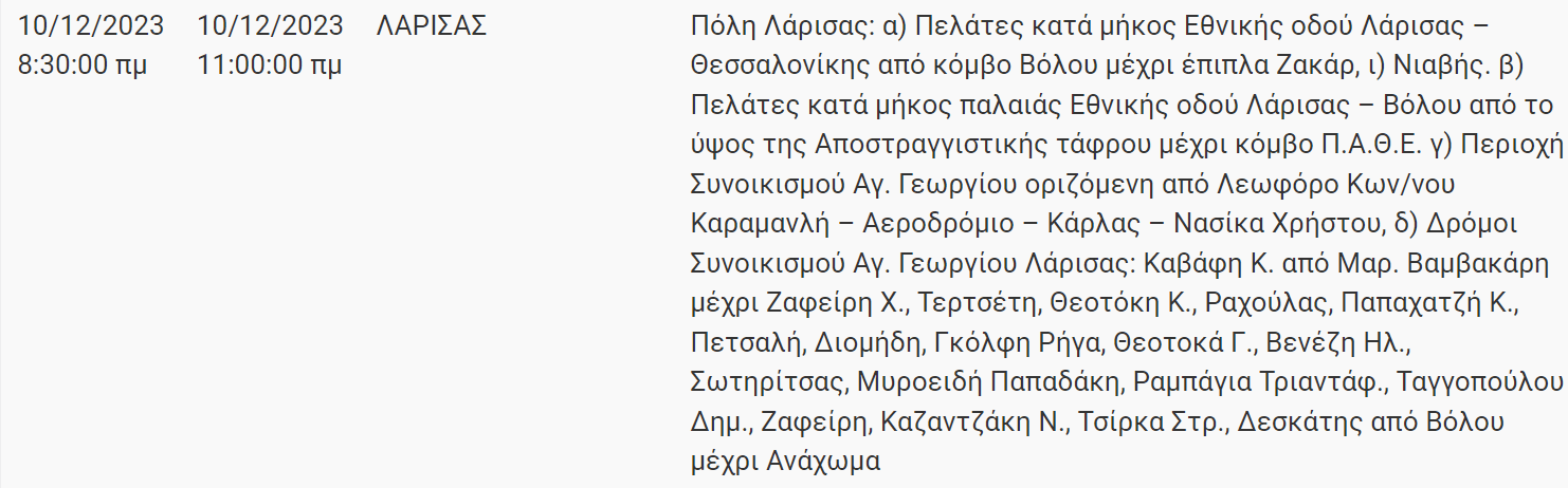 Σε προγραμματισμένη διακοπή στην παροχή ηλεκτρικού ρεύματος σε δρόμους της Λάρισας θα προχωρήσει σήμερα Κυριακή 10 Δεκεμβρίου 2023 ο ΔΕΔΔΗΕ Α.Ε.