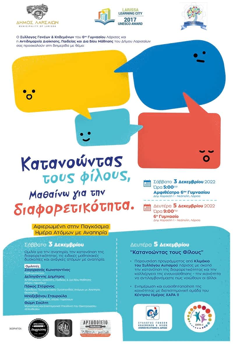 Με αφορμή την παγκόσμια ημέρα ατόμων με αναπηρία, ο Σύλλογος Γονέων και Κηδεμόνων του 6ου Γυμνασίου Λάρισας σε συνεργασία τη Διεύθυνση Παιδείας του Δήμου Λαρισαίων διοργανώνουν δυο σημαντικές δράσεις με σκοπό την ευαισθητοποίηση και ενημέρωση για θέματα αναπηρίας. Οι δράσεις εντάσσονται στο πλαίσιο της “Λάρισα – Πόλη που Μαθαίνει” και του Πανεπιστημίου των Πολιτών Λάρισας.