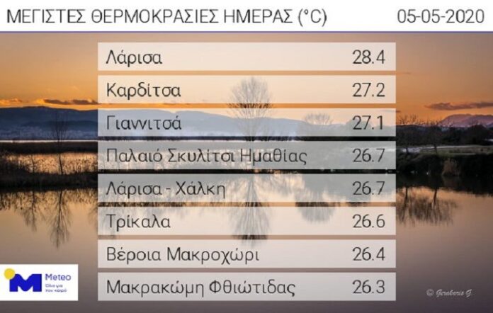 Οι υψηλότερες θερμοκρασίες καταγράφονται στη Λάρισα όπου ο υδράργυρος έφτασε τους 28.4 C και στην Καρδίτσα όπου έφτασε τους 27.2 C.