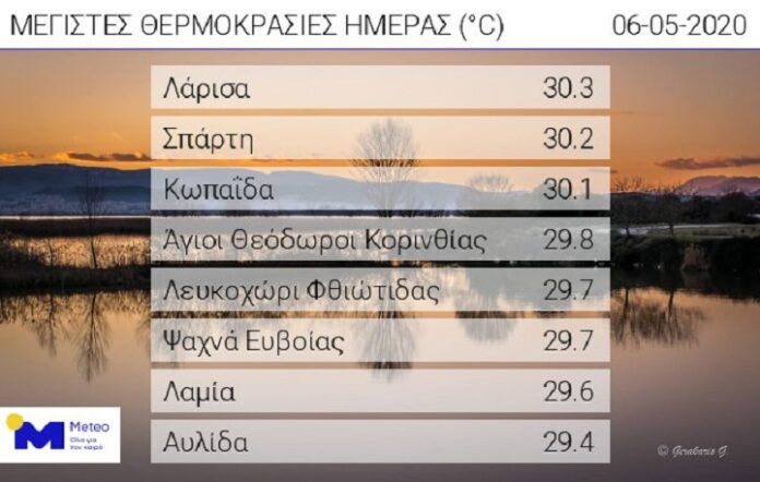 Οι υψηλότερες θερμοκρασίες καταγράφονται στη Λάρισα όπου ο υδράργυρος έφτασε τους 30.3 C και στην Σπάρτη όπου έφτασε τους 30.2 C.