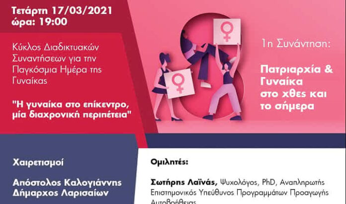 Η πρώτη συνάντηση με τίτλο «Πατριαρχία και γυναίκα στο χθες και το σήμερα» θα πραγματοποιηθεί σήμερα Τετάρτη 17 Μαρτίου στις 7 μ.μ και θα μεταδοθεί στο κανάλι του Δήμου Λαρισαίων στο YouTube.