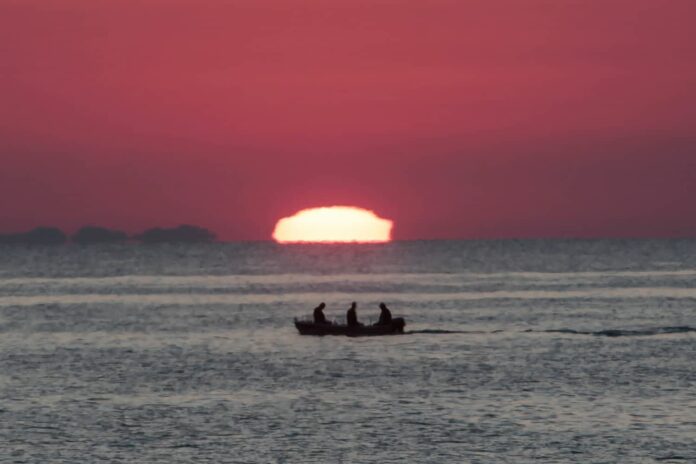 Το Αιγαίο Πέλαγος, όπως και ο ουρανός, γεμίζουν χρώματα τα οποία απαθανατίστηκαν από τον φωτογραφικό φακό του Θανάση Καλλιάρα (Eurokinissi):