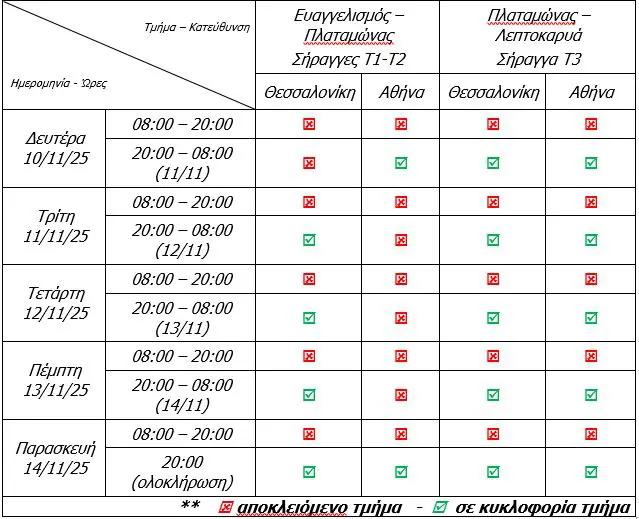 - Τρίτη 11 Νοεμβρίου 2025 απόγευμα: απόδοση σε κυκλοφορία τμήματος Ευαγγελισμός – Λεπτοκαρυά προς Θεσσαλονίκη και Λεπτοκαρυά – Πλαταμώνας προς Αθήνα (θα παραμείνει αποκλεισμένο το τμήμα Πλαταμώνας – Ευαγγελισμός προς Αθήνα).