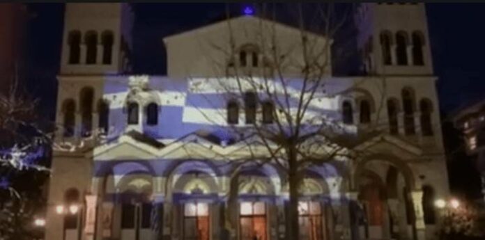 Ο Ιερός Ναός Αγίου Νικολάου Λαρίσης φωταγωγημένος στα χρώματα της Ελληνικής Σημαίας, την 24η Μαρτίου 2021, στο πλαίσιο των εορταστικών εκδηλώσεων για τα 200 χρόνια από την Επανάσταση του 1821.