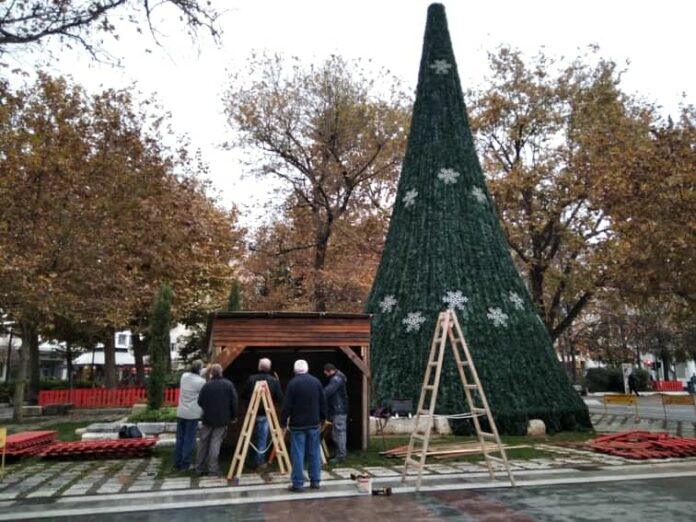 Συνεχίζεται η τοποθέτηση του εορταστικού διάκοσμου στη Λάρισα, ενώ το πρωί της Πέμπτης συνεργείο στήνει την«φάτνη» κάτω από το Χριστουγεννιάτικο Δέντρο, στην Κεντρική Πλατεία της πόλης: