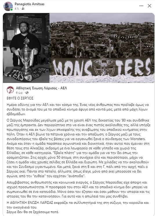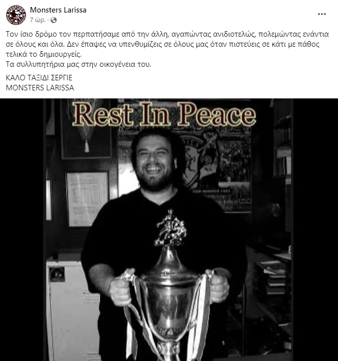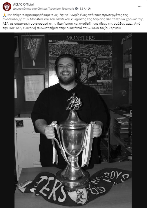ΠΑΕ ΑΕΛ: «Με θλίψη πληροφορηθήκαμε πως “έφυγε” νωρίς ένας από τους πρωτεργάτες της ανασύνταξης των Monsters και του οπαδικού κινήματος της Λάρισας στα “πέτρινα χρόνια” της ΑΕΛ, με σημαντική συνεισφορά στην διατήρηση και ανάδειξη της ιδέας της ομάδας μας… Από την ΠΑΕ ΑΕΛ, ειλικρινή συλλυπητήρια στην οικογένειά του… Καλό ταξίδι Σέργιε!!!»