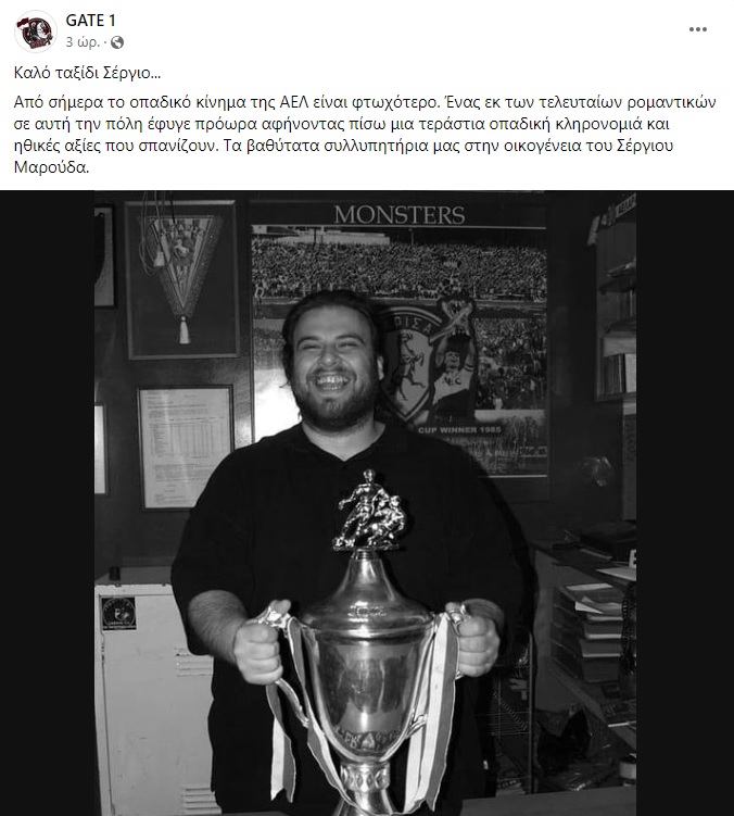 GATE 1: «Καλό ταξίδι Σέργιο… Από σήμερα το οπαδικό κίνημα της ΑΕΛ είναι φτωχότερο. Ένας εκ των τελευταίων ρομαντικών σε αυτή την πόλη έφυγε πρόωρα, αφήνοντας πίσω μια τεράστια οπαδική κληρονομιά και ηθικές αξίες που σπανίζουν. Τα βαθύτατα συλλυπητήριά μας στην οικογένεια του Σέργιου Μαρούδα».