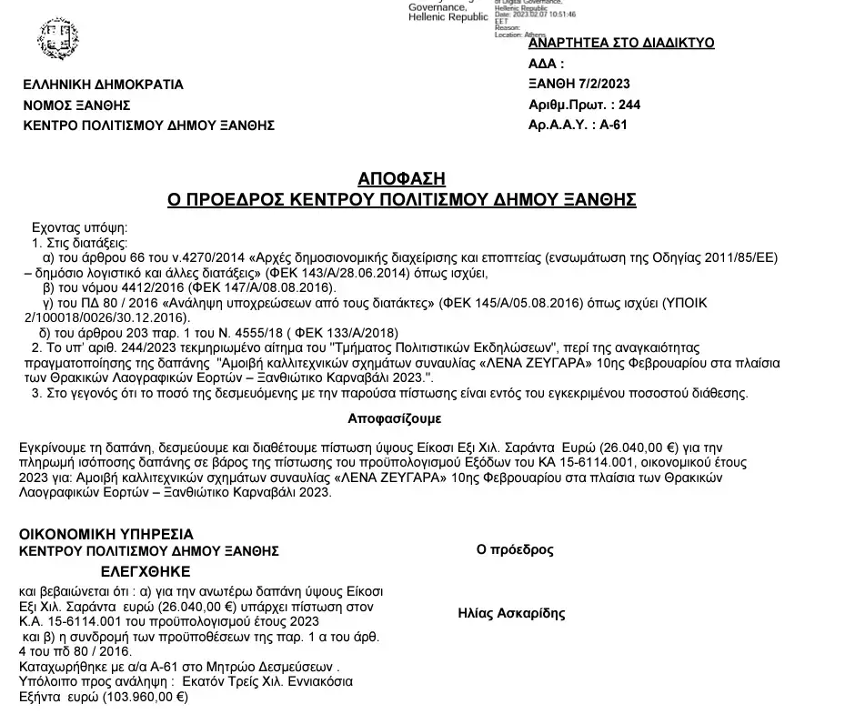 Ένα έγγραφο που δείχνει ότι η αμοιβή που θα πάρει η Λένα Ζευγαρά, η οποία θα ανοίξει σήμερα τις εκδηλώσεις για το Καρναβάλι της Ξάνθης κάνει τον γύρο του διαδικτύου τις τελευταίες ώρες. Το έγγραφο δημοσιεύτηκε στη «Διαύγεια» και δείχνει ότι η δημοφιλής τραγουδίστρια θα λάβει από το Κέντρο Πολιτισμού Δήμου Ξάνθης ως αμοιβή / καλλιτεχνική δαπάνη 26.040 ευρώ για να εμφανιστεί στην πόλη της βόρειας Ελλάδας.