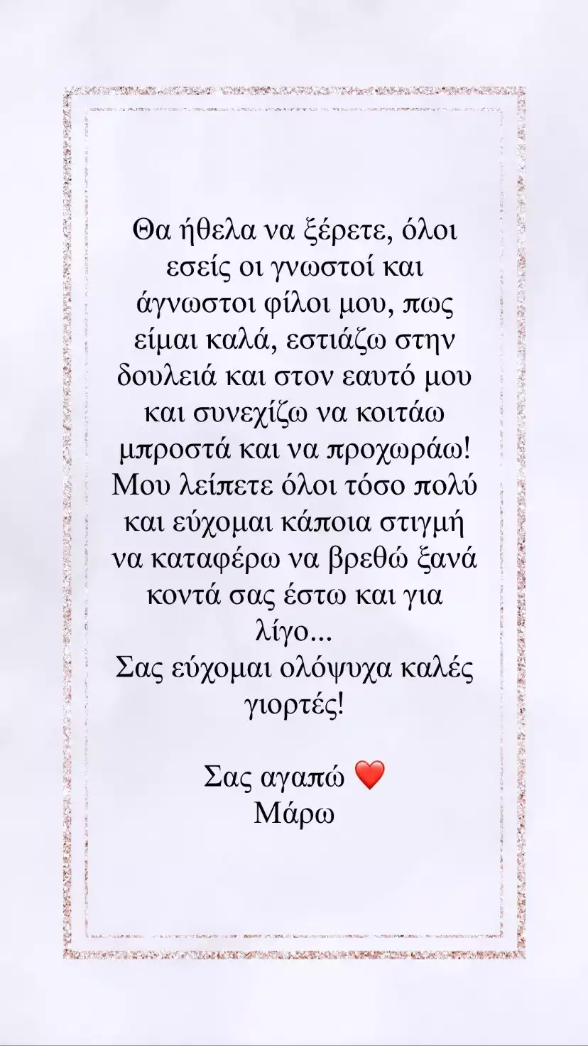Θα ήθελα να ξέρετε όλοι, εσείς οι γνωστοί και οι άγνωστοι φίλοι μου, πως είμαι καλά εστιάζω στη δουλειά και τον εαυτό μου και συνεχίζω να κοιτάω μπροστά και να προχωράω. Μου λείπετε όλοι τόσο και εύχομαι κάποια στιγμή να καταφέρω να βρεθώ ξανά κοντά σας έστω και για λίγο. Σας εύχομαι ολόψυχα καλές γιορτές. Σας αγαπώ. Μάρω»