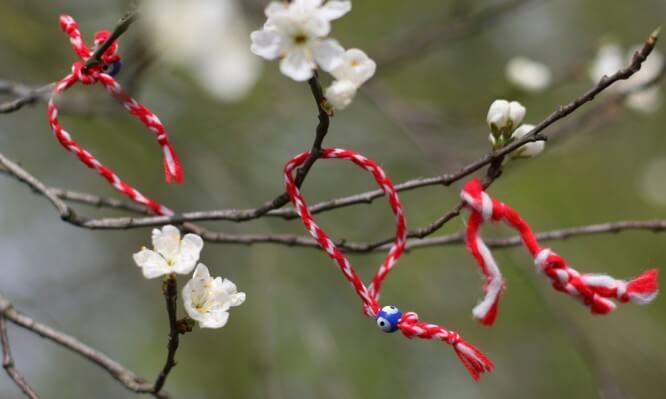 Τηρώντας αντίστοιχα έθιμα οι Βούλγαροι, την πρώτη ημέρα του Μάρτη, φορούν στο πέτο τους στολίδια φτιαγμένα από άσπρες και κόκκινες κλωστές, τα οποία ονομάζονται Μαρτενίτσα, ενώ σε κάποιες περιοχές της Βουλγαρίας, οι κάτοικοι τοποθετούν έξω από τα σπίτια τους ένα κομμάτι κόκκινου υφάσματος για να μην τους «κάψει η γιαγιά Μάρτα» (Μπάμπα Μάρτα, στα βουλγαρικά), η οποία είναι η θηλυκή προσωποποίηση του μήνα Μάρτη.