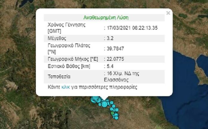 Σύμφωνα με το Γεωδυναμικό Ινστιτούτο του Εθνικού Αστεροσκοπείου Αθηνών στις 10.22 το πρωί καταγράφηκε σεισμική δόνηση 3,2 Ρίχτερ. Το επίκεντρο ήταν 16 Χλμ. ΝΔ της Ελασσόνας. Το εστιακό βάθος ήταν 5,4 χλμ.