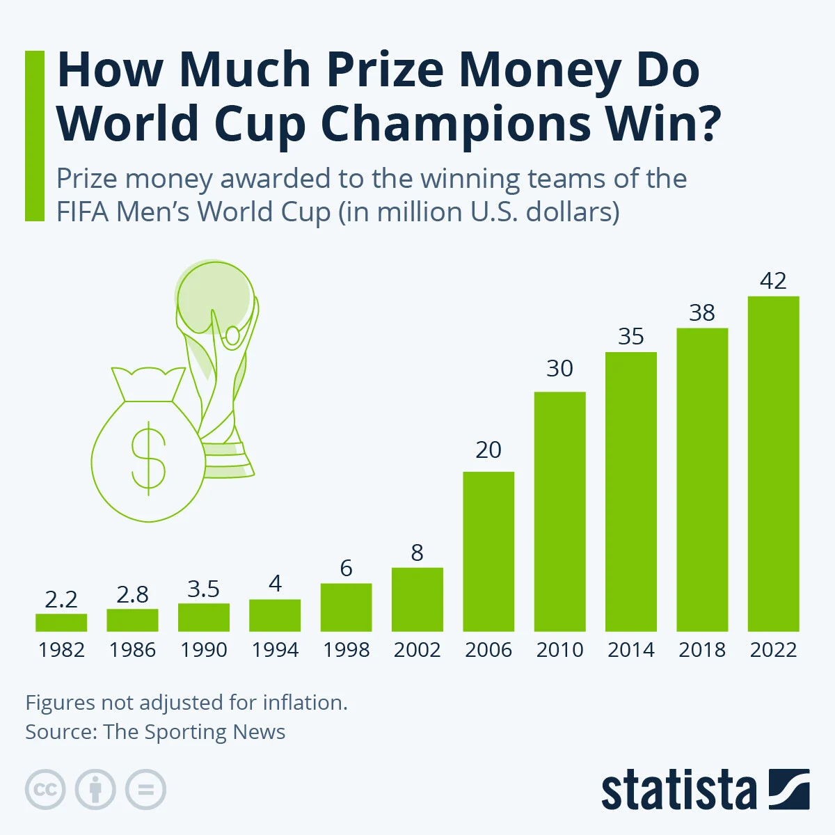 Εκεί που τα κορυφαία κέρδη ήταν μόλις 2,2 εκατομμύρια δολάρια για τους πρωταθλητές του ’82 στην Ισπανία, το ποσό ανέβηκε στα 8 εκατομμύρια δολάρια στην Ιαπωνία/Νότια Κορέα το 2002, πριν υπερδιπλασιαστεί στα 20 εκατομμύρια δολάρια για το τουρνουά του 2006 που διεξήχθη στη Γερμανία. Τα πακέτα αμοιβών συνεχίζουν να αυξάνονται από τότε, με το 2022 να προσφέρει 4 εκατομμύρια δολάρια περισσότερα από το Παγκόσμιο Κύπελλο της Ρωσίας το 2018.