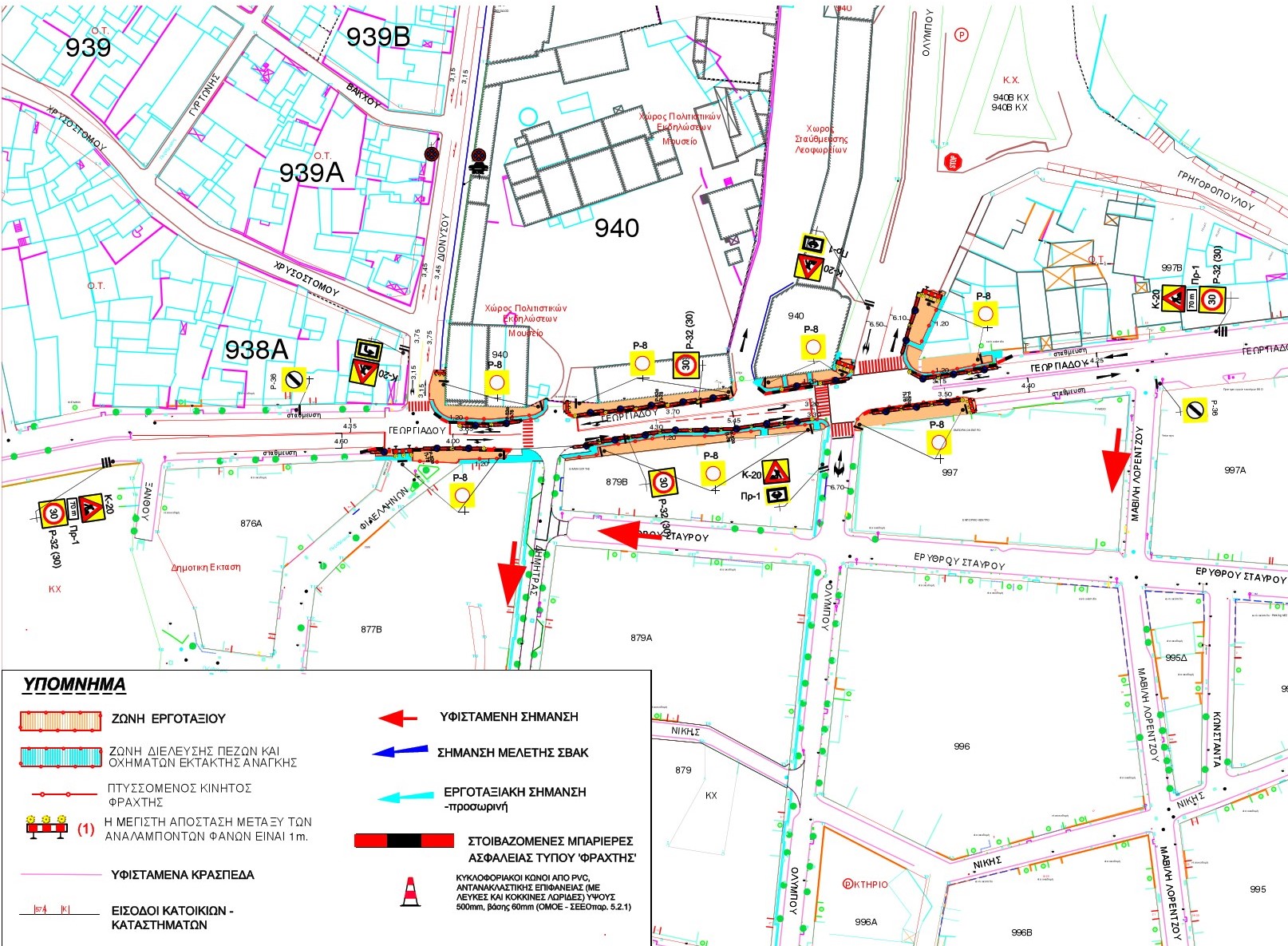 Ειδικότερα κατά τη διάρκεια των εργασιών του σταδίου Α29, η κυκλοφορία των οχημάτων στην οδό ΓΕΩΡΓΙΑΔΟΥ με κατεύθυνση από την οδό ΦΙΛΕΛΛΗΝΩΝ προς την οδό ΛΟΡ. ΜΑΒΙΛΗ θα γίνεται σε μία λωρίδα κυκλοφορίας πλάτος 3,50μ έως 4,30μ (τοπική μείωση της λωρίδας κυκλοφορίας από 4,40μ / 4,60μ) , λόγω της στένωσης του οδοστρώματος στην δεξιά πλευρά της οδού σύμφωνα με την κίνηση των οχημάτων από την οδό Φιλελλήνων προς την οδό Λ. Μαβίλη – επιτρέποντας την αριστερή στροφή προς την οδό ΟΛΥΜΠΟΥ δημιουργώντας πρόσθετη λωρίδα πλάτους 3,20μ.