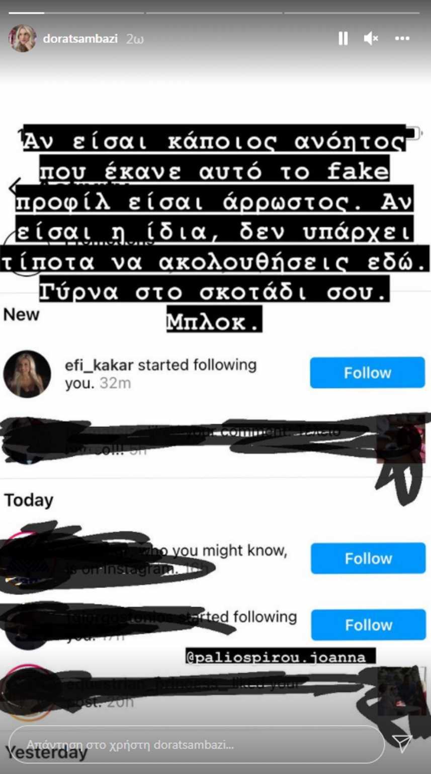 Η Δώρα Τσαμπάζη συνειδητοποίησε πως ένα προφίλ με όνομα «Έφη Κακαράτζουλα» -και μια φωτογραφία της που έχει δημοσιευτεί στα media- την «ακολούθησε» στο Instagram και ξέσπασε, γράφοντας: «Αν είσαι κάποιος ανόητος που έκανε αυτό το fake προφίλ είσαι άρρωστος. Αν είσαι η ίδια, δεν υπάρχει τίποτα να ακολουθήσεις εδώ. Γύρνα στο σκοτάδι σου. Μπλοκ.»!