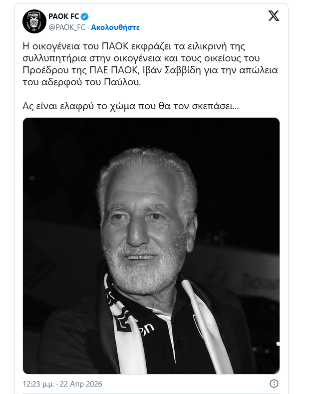 Σε βαρύ πένθος βρίσκεται η οικογένεια του ΠΑΟΚ, καθώς έφυγε από τη ζωή ο Παύλος Σαββίδης, αδερφός του Ιβάν Σαββίδη, σε ηλικία 72 ετών.